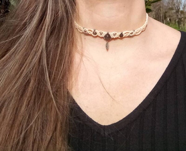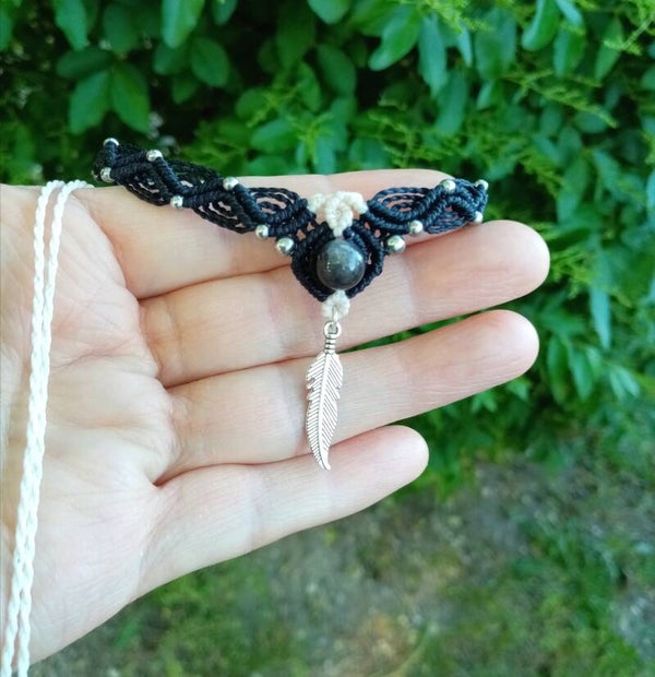 - Les chokers Alma, élégants et au tissage entrelacé qui se déploie comme des ailes, arborés de perles de pierres naturelles au choix, labradorite qualité AA+ aux reflets surnaturels (protection), améthyste chevronnée du Brésil (sérénité et clarification de l'esprit) et ornés d'une belle plume d'acier inoxydable.