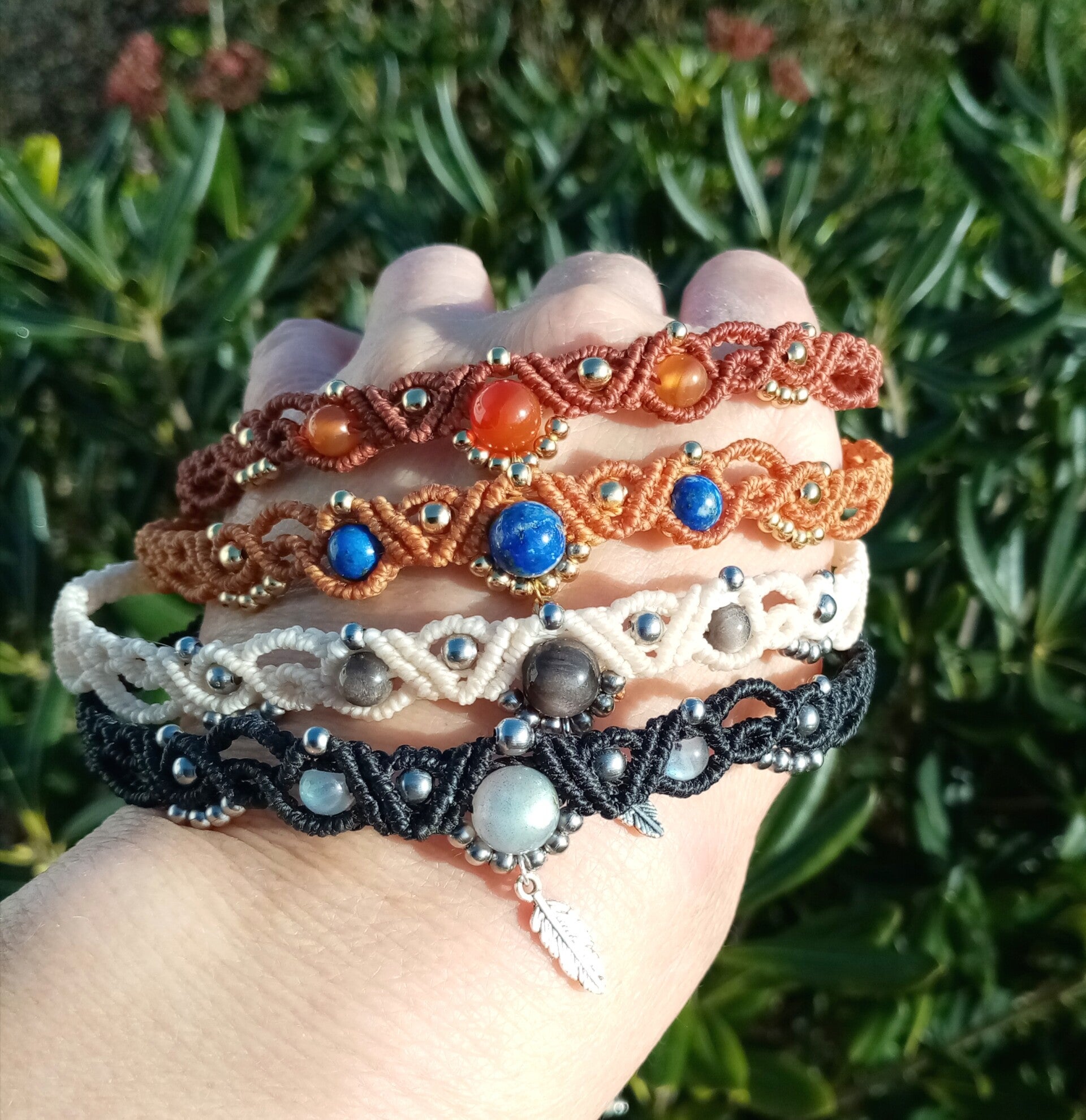 - Nouveaux Les chokers Fairy, au tissage fin et élégant, avec des perles de pierres naturelles de cornaline, lapis lazuli, obsidienne argentée ou labradorite et une petite plume en acier inoxydable, version dorée ou argentée au choix.
