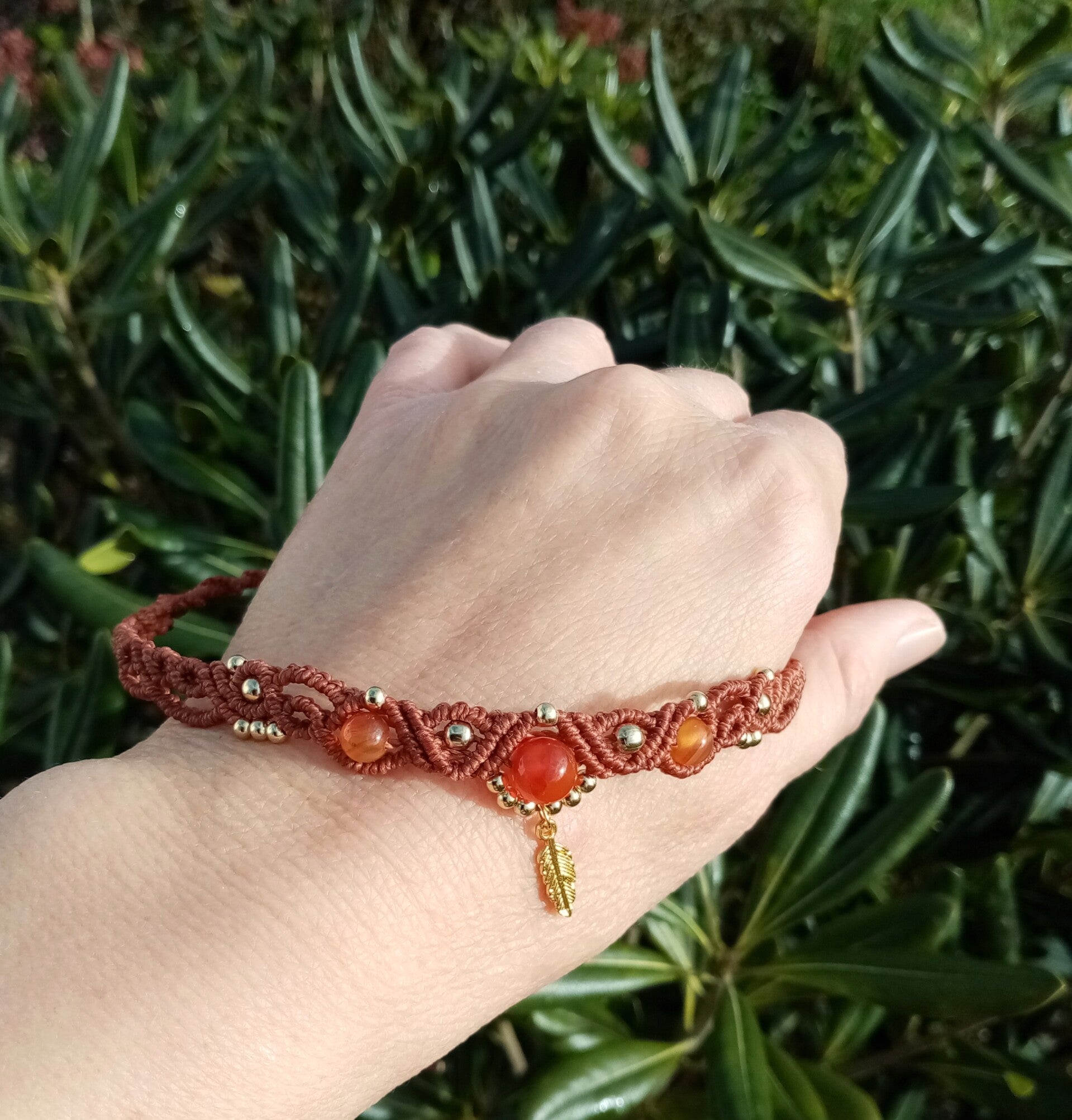Technique artisanale du micromacramé, fils linhasita du Brésil, perles dorées d'acier inoxydable