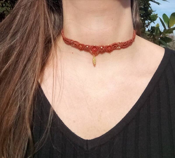 - Choker Séléna, avec connecteur tressé en laiton serti d'une pierre de lune aux reflets bleutés, mis en valeur par un tissage rouge bordeaux